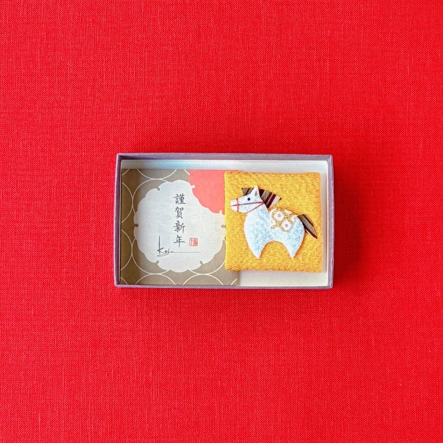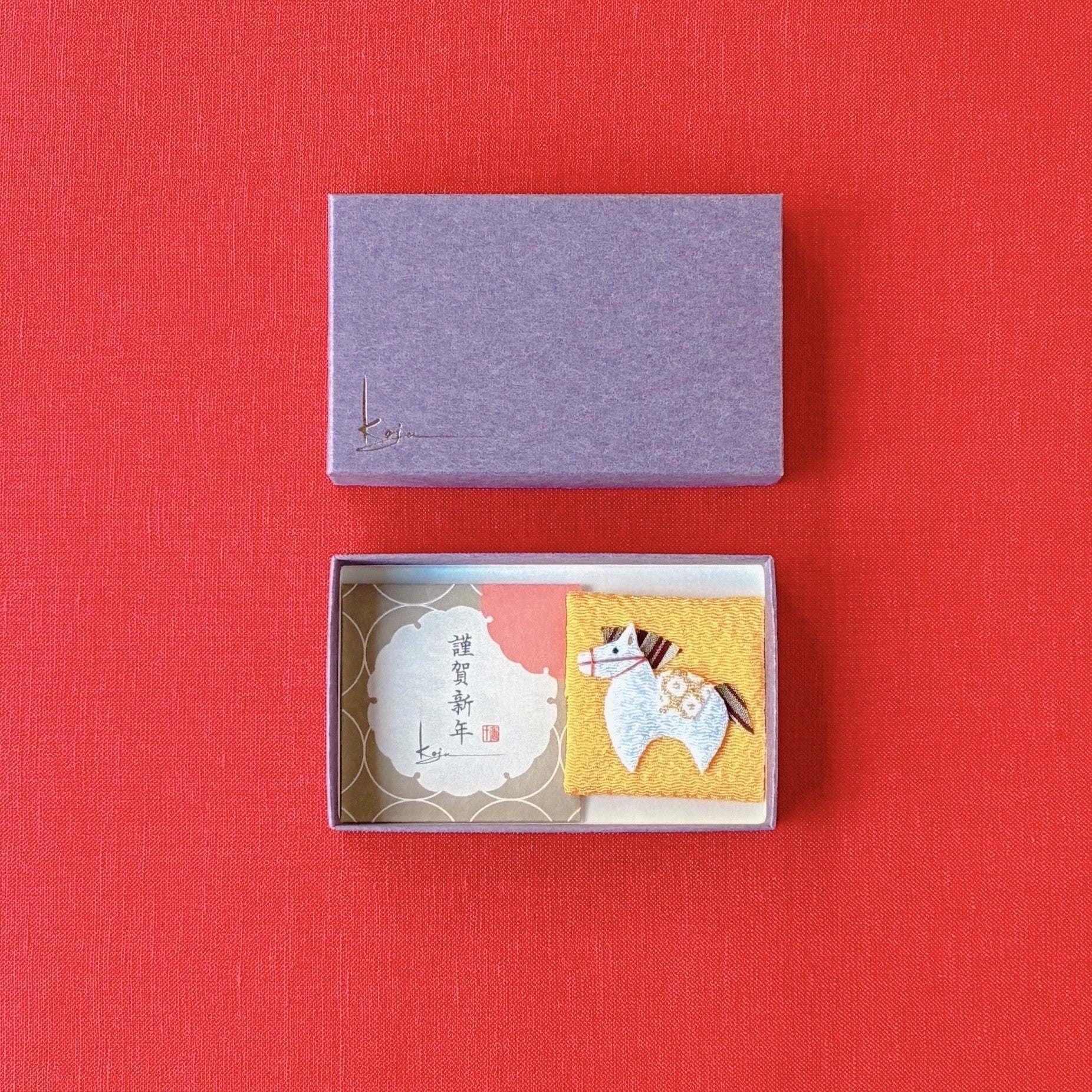 名私香「謹賀新年」(伽羅の香り入)と干支「午」押絵名私香ケースを箱にお入れしました。年末のご挨拶やお年賀、ちょっとした贈り物にぜひご利用ください。